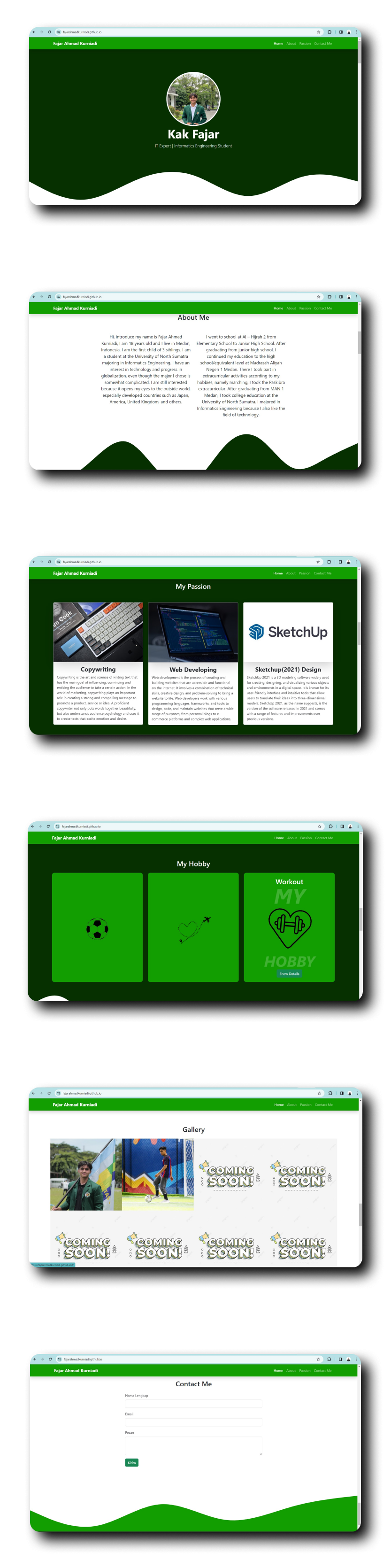 This is what my first website portfolio looks like. What you are opening is my second website portfolio. I made the website using the Bootstrap framework and I didn't make the UI/UX Design first because I made this by looking at tutorials from YouTube and the channel is called "Web Programming UNPAS" with the mentor being my own lecturer, Shandika Galih. Hahaha people who see my first web portfolio design will definitely be familiar that it is a design from Shandika Galih taught in the tutorial. Because the video tutorial is like a saviour for IT students to learn the web. If you want to visit it, click this link