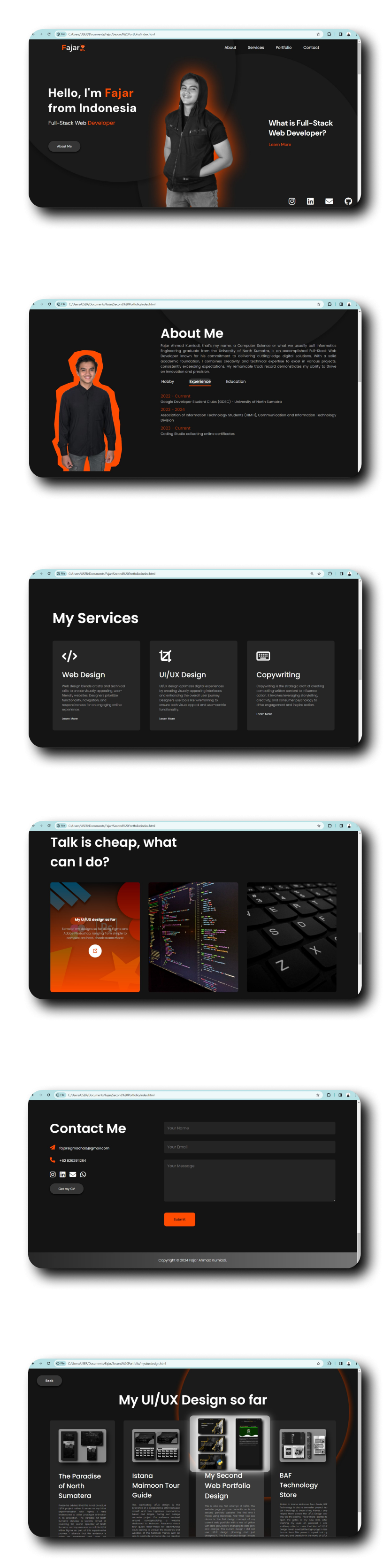 My second portfolio, unlike its predecessor, took shape without the initial implementation of UI/UX design principles. Similar to the genesis of my inaugural portfolio, this digital masterpiece emerged from the crucible of online learning, sculpted through the guidance of video tutorials sourced from the vast repository of YouTube. However, this rendition underwent a metamorphosis of its own, infused with bespoke modifications and personalized touches to tailor-fit its essence to my evolving vision. While devoid of the structured framework of UI/UX design at its inception, this portfolio stands as a testament to my adaptability and ingenuity, a fusion of curated knowledge and intuitive creativity birthed in the boundless expanse of the digital realm.